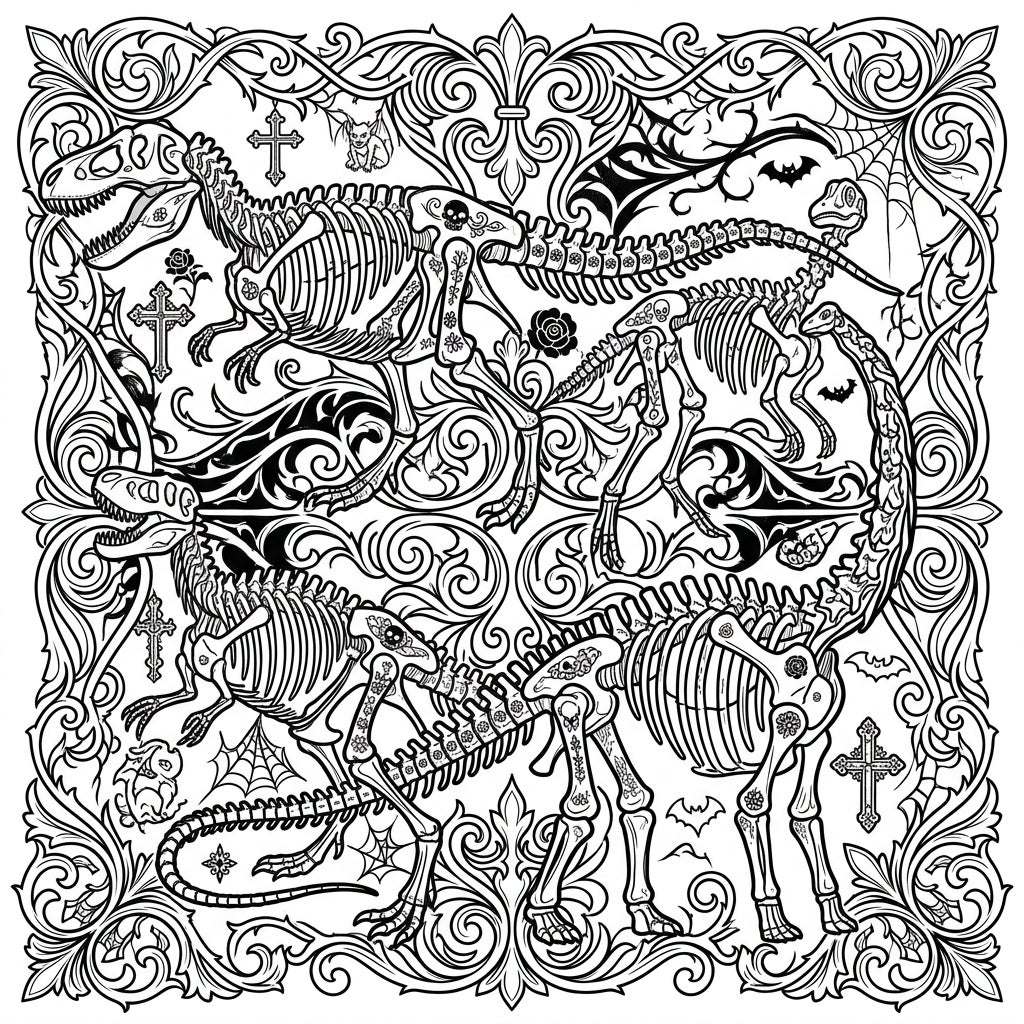 Journey back to a prehistoric era reimagined with a dark, enchanting twist in this stunning Gothic dinosaur skeletons coloring page. Discover intricate fossilized forms intertwined with ornate Victorian patterns, perfect for a captivating artistic escape.