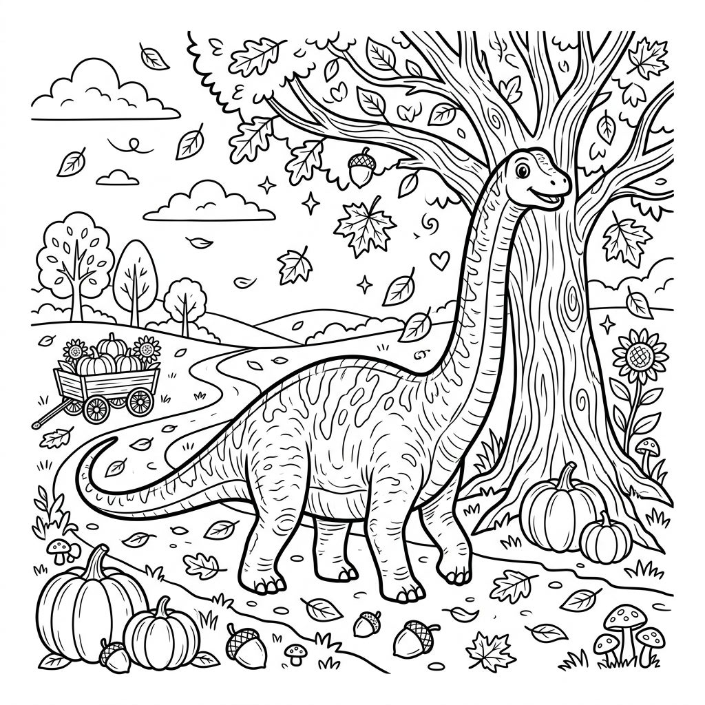 Step into a charming autumn scene with our unique Diplodocus dinosaur coloring page. This intricate illustration features a long-necked Diplodocus with a gentle smile, its body textured with scales, standing gracefully amidst a quintessential fall landscape. Large oak leaves drift from a majestic tree, while plump pumpkins, tiny acorns, and curious mushrooms dot the grassy ground. In the background, a rustic wagon overflows with a harvest of gourds and bright sunflowers, set against rolling hills and a cloud-dotted sky, inviting you to explore every detail.