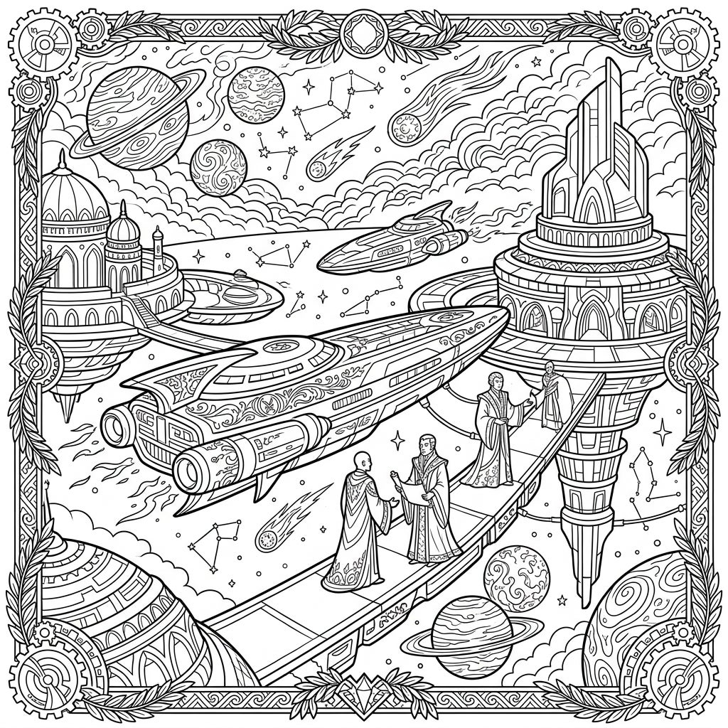 Dive into a breathtaking sci-fi world with this detailed coloring page, featuring elegant diplomatic courier ships navigating a bustling space city. Explore intricate architecture, cosmic wonders, and robed figures engaged in interstellar negotiations.
