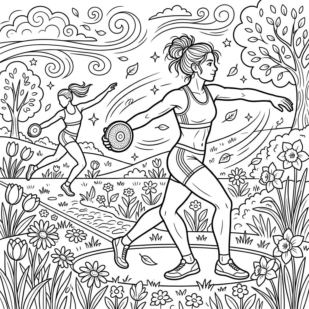 Experience the thrill of spring athletics with this vibrant coloring page featuring powerful discus throwers. Immerse yourself in a blooming landscape and bring this dynamic scene to life with your favorite colors.
