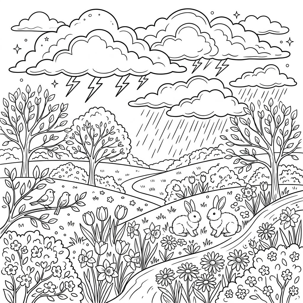 This intricate coloring page captures a breathtaking moment where the serenity of spring meets the dramatic power of a faraway storm. In the foreground, a tapestry of lush foliage unfurls, adorned with the delicate blooms of tulips, cheerful daffodils, and charming daisies. Two sweet rabbits find a cozy spot amidst the flora, while a pair of birds perches peacefully on a budding branch. Beyond the rolling hills, a winding path leads into the distance, all beneath a dynamic sky.