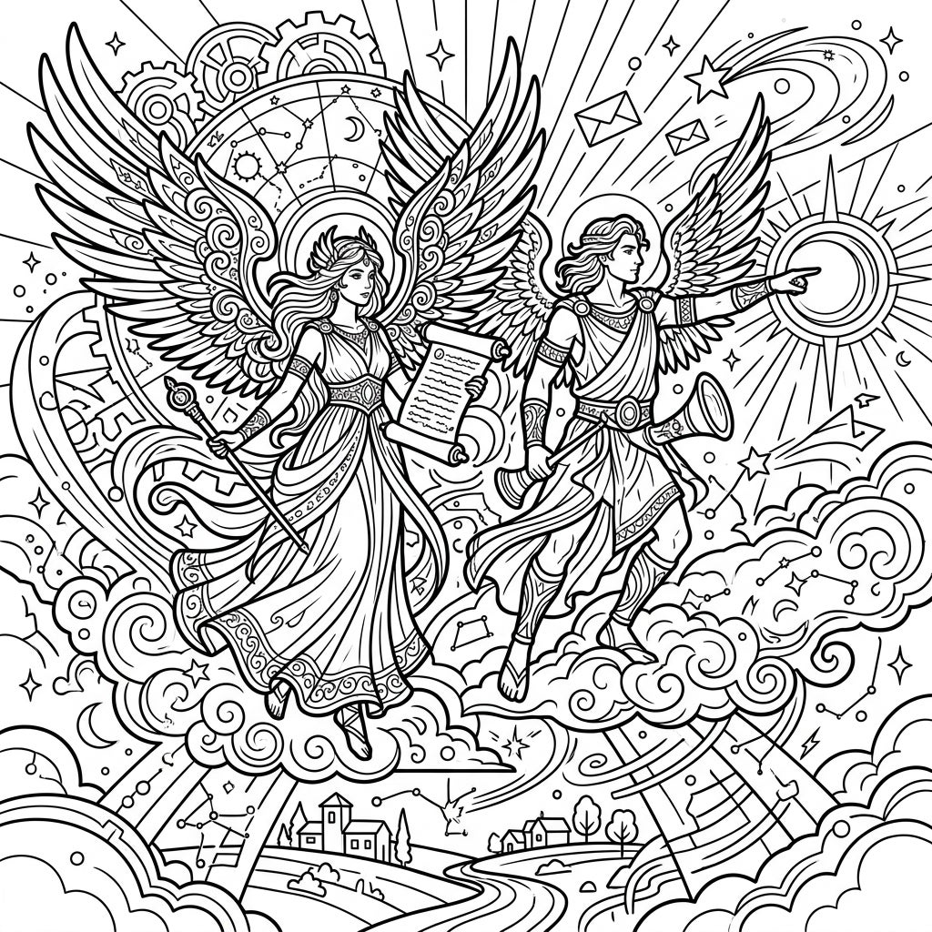 This captivating coloring template invites you to delve into a realm where divine messengers take flight. Observe the intricate details of two majestic winged figures, a serene goddess holding a mystical scroll and staff, and a powerful god with a trumpet, pointing towards a luminous celestial body. Their elegant, flowing robes and magnificent feathered wings are rendered with fine lines, offering an abundance of textures and patterns waiting to be brought to life with your chosen colors.