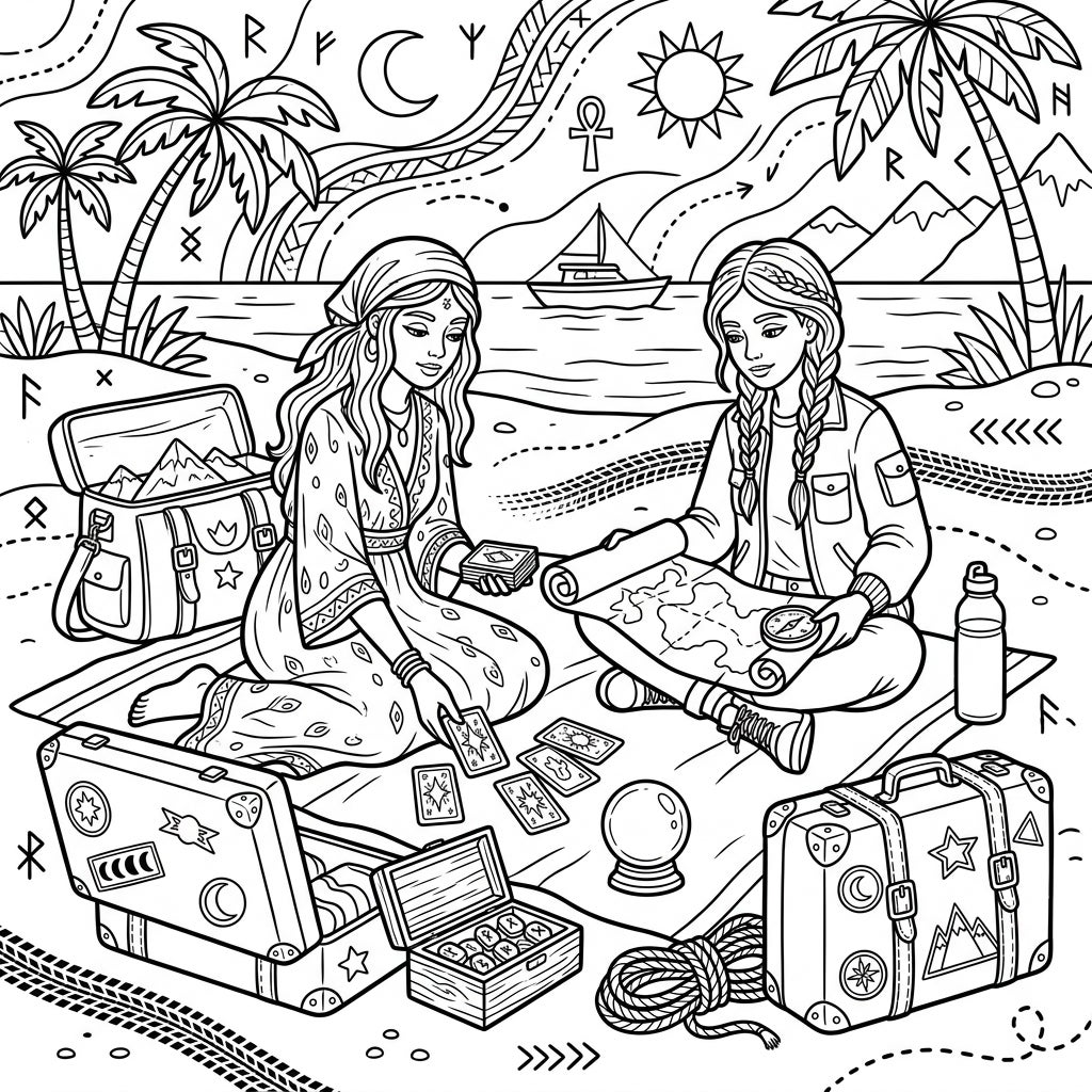 Dive into an intricately designed coloring page showcasing two captivating diviners enjoying a serene beach vacation. One diviner, adorned in a flowing patterned dress and headscarf, thoughtfully arranges tarot cards on a blanket, while her companion with braided hair intently studies a rolled-out map, compass in hand. Around them, elements of adventure and mysticism abound: open suitcases brimming with treasures, a small chest revealing ancient runes, a glistening crystal ball, and a coiled rope ready for new explorations. In the background, picturesque palm trees sway near a calm ocean where a sailboat glides, framed by distant mountains and celestial symbols like the sun and moon, all rendered in a clean, engaging linear art style.