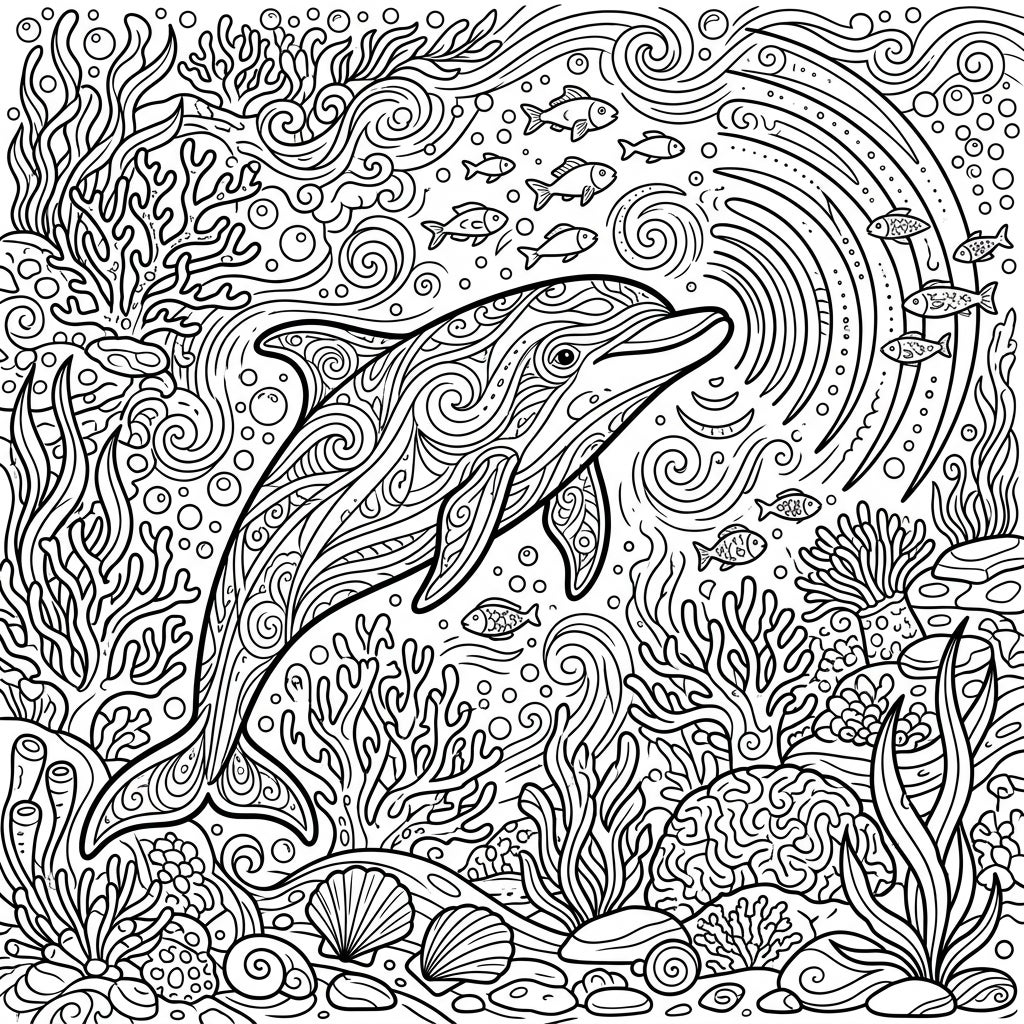 Unleash your creativity as you decide on the perfect palette for this underwater spectacle. Consider vibrant blues and greens for the water and seaweed, playful oranges and yellows for the fish, and perhaps shimmering silver or grey for the dolphin itself. Experiment with shading to give depth to the coral and bubbles, making this aquatic scene truly pop with your personal artistic vision. What colors will you choose to illuminate this dolphin's sonic world?