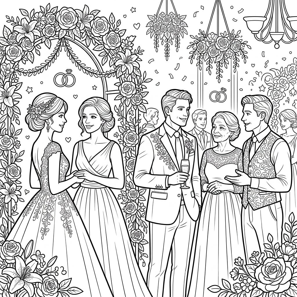 Step into a world of elegance with this exquisite coloring page, capturing a romantic wedding celebration. The scene unfolds with beautifully detailed figures, including two graceful women in stunning wedding gowns, two distinguished men in stylish suits, and an esteemed older woman, all engaged in joyful conversation. Lush floral arches adorned with roses and lilies frame the setting, while delicate hanging bouquets and subtle floating wedding rings add to the festive atmosphere, inviting you to bring this cherished moment to life with your colors.