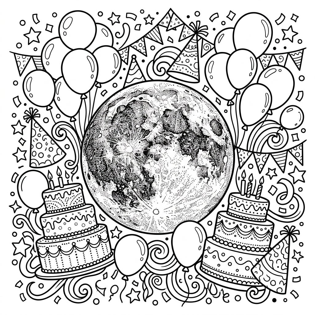 Dive into a universe of celebration with this unique coloring page! At its heart lies a majestic celestial moon, rendered with intricate dot work patterns that beautifully capture its craters and mystical texture. This isn't just any moon; it's the centerpiece of a fantastical birthday party, surrounded by a delightful array of festive elements designed to spark your imagination. Discover the joy in every detail, from the textured lunar surface to the playful party adornments that swirl around it.