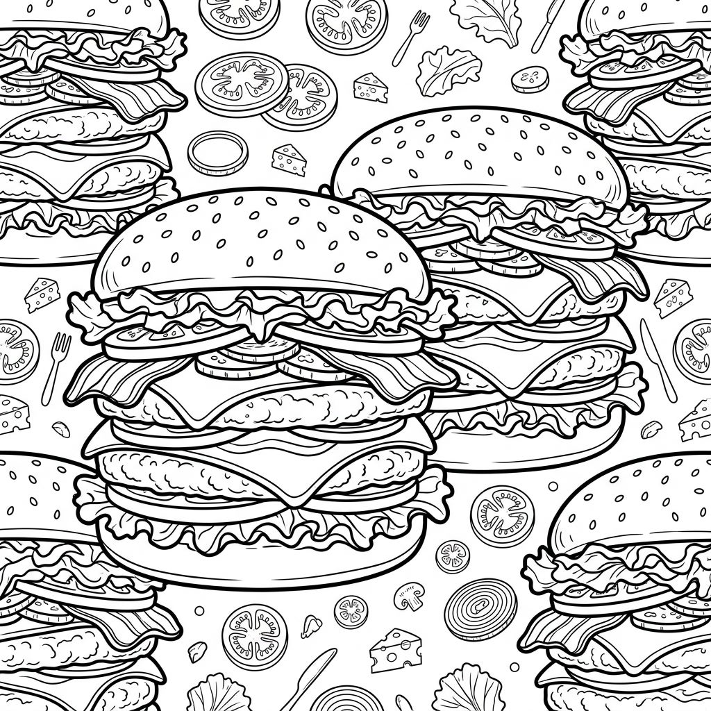 Prepare for a feast for your eyes with this mouth-watering double patty burger coloring page! This intricate illustration features several generously stacked burgers, each boasting two thick patties, melted cheese, crisp lettuce, juicy tomato slices, and savory bacon, all nestled within a sesame seed bun. The background isn't just plain; it's a delightful spread of scattered burger ingredients like individual tomato slices, delicate lettuce leaves, sharp onion rings, small cheese wedges, and even tiny forks and knives, creating a rich and immersive coloring experience.