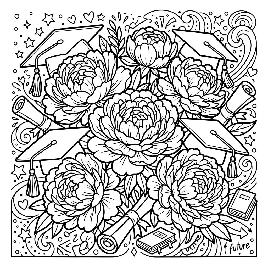 Mark the special milestone of graduation with this beautifully designed coloring page, blending the lush elegance of double peonies with classic academic symbols. It's a perfect way to celebrate achievements and inspire future dreams through creative coloring.