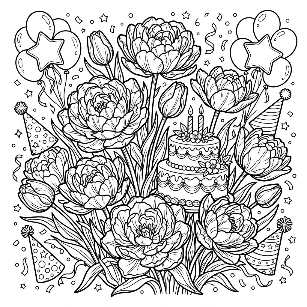 Immerse yourself in a festive floral celebration with this delightful coloring page featuring lush double tulips. Adorned with birthday cakes, balloons, and party hats, it promises a joyful coloring experience for any occasion.