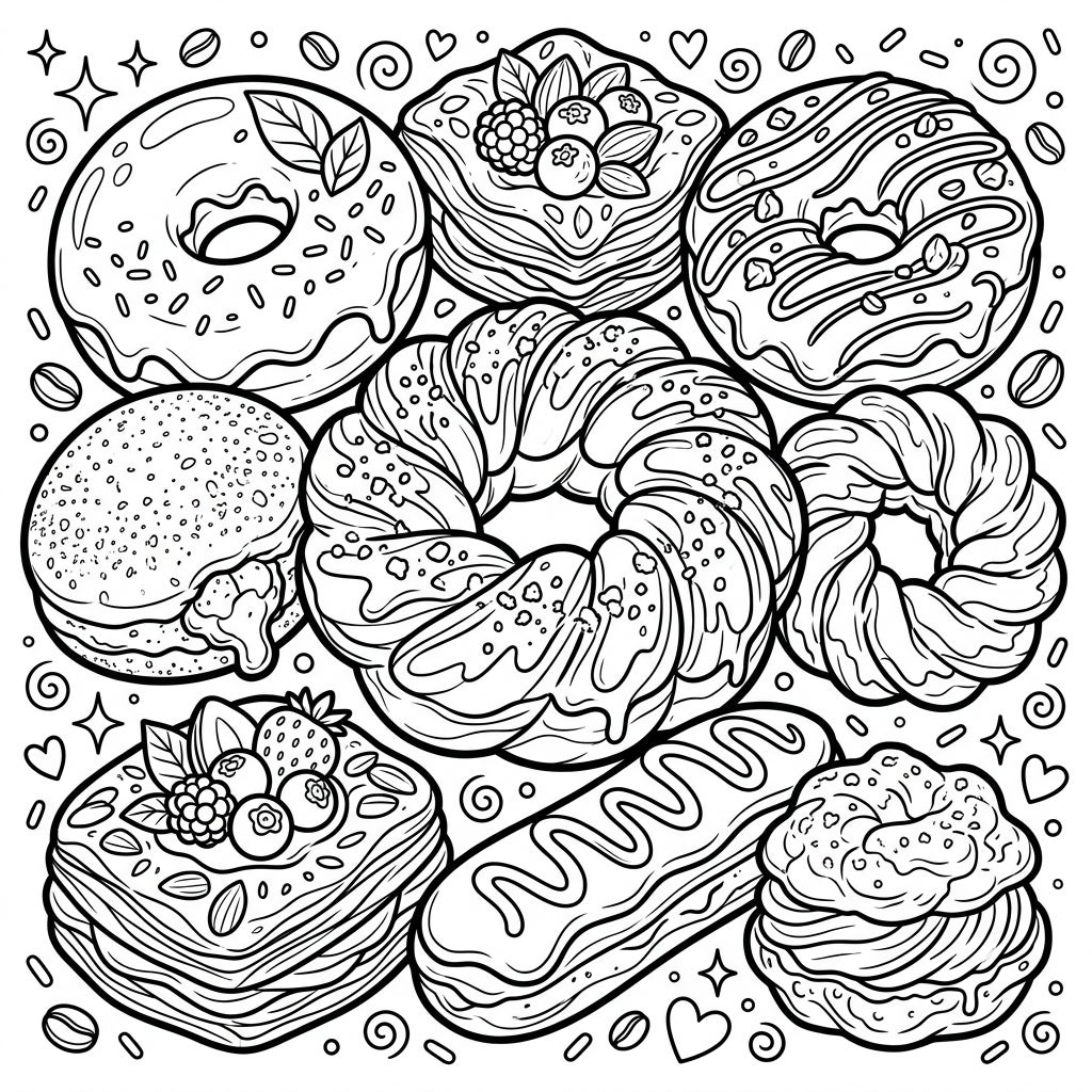 Dive into a world of delectable treats with this enchanting coloring page, brimming with an irresistible array of doughnuts and pastries. This intricate design showcases a delightful variety, including classic glazed doughnuts with sprinkles, a flaky bear claw, elegant eclairs, and layered pastries adorned with luscious berries. Each item is rendered with inviting, bold outlines, ready for you to bring them to life with your favorite colors.
