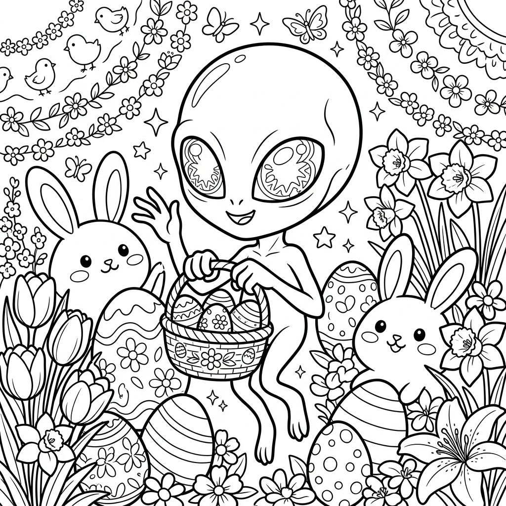 Dive into a truly unique spring scene where the mythical Dover Demon joins an Easter celebration! This intricate coloring page features the iconic alien creature, known for its distinctive large head and wide eyes, holding a charming basket overflowing with beautifully patterned Easter eggs. Flanking our extraterrestrial friend are two endearing bunnies, their sweet faces peeking out from a lush arrangement of tulips, daffodils, and lilies, all rendered with inviting, soft lines perfect for coloring.