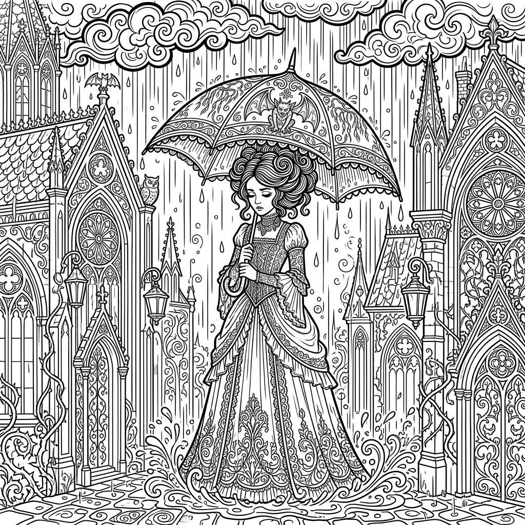 This captivating coloring template presents a beautifully composed gothic scene, centered around an elegant lady braving a heavy downpour. She stands poised, holding a magnificent, intricately patterned umbrella adorned with a winged gargoyle-like figure, protecting her elaborate coiffure and voluminous, detailed gown. Surrounding her are majestic gothic structures with spires, arched windows, and decorative flourishes, while the ground below her is covered in swirling puddles and rain splashes, all under a sky filled with dramatic, swirling clouds.
