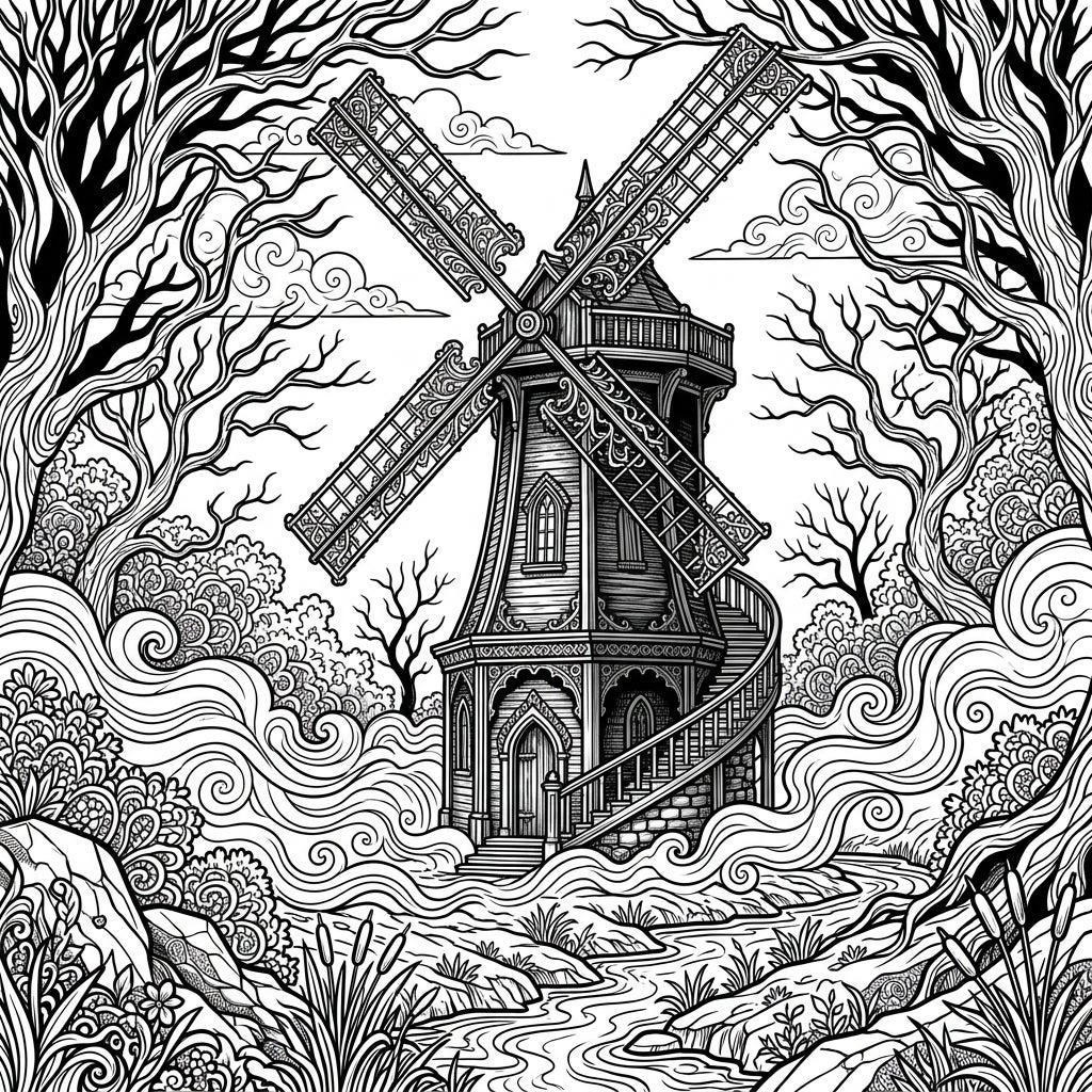 Immerse yourself in the intricate beauty of this gothic drainage windmill coloring page. Every element is crafted with exquisite detail, from the grand, ornate structure of the windmill itself, adorned with Victorian-inspired patterns and a striking spiral staircase, to its majestic blades. Surrounding this imposing edifice, gnarled, ancient trees with bare branches frame the scene, while swirling patterns evoke mysterious mists or flowing water, creating a landscape rich with texture and depth, ready for your artistic touch.