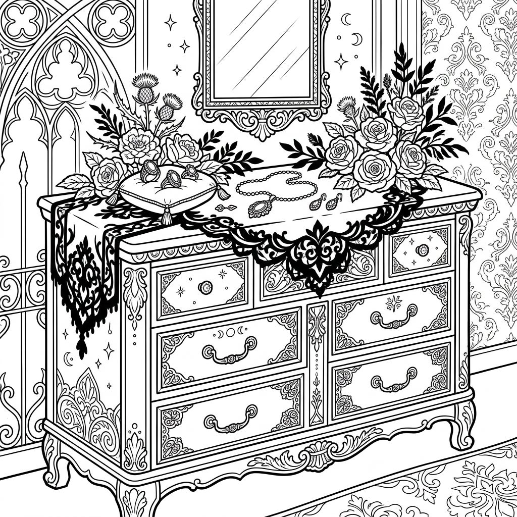 Dive into the melancholic beauty of a Gothic wedding celebration with this intricately designed dresser coloring page. Adorned with Victorian lace and elegant jewelry, it's a perfect blend of romance and dark aesthetic.