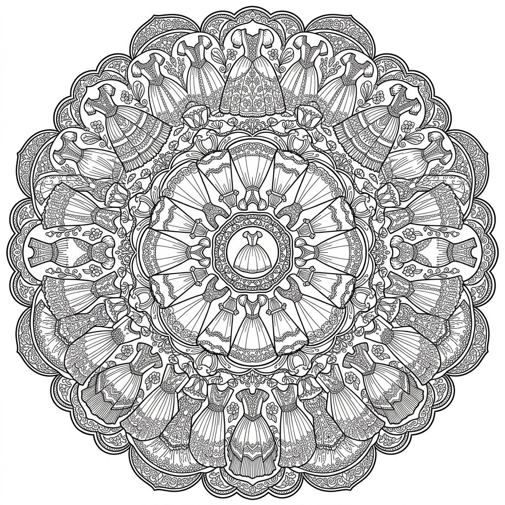 Unleash your inner fashionista with this exquisite adult coloring page featuring a stunning mandala design crafted from elegant dresses. Explore intricate patterns and find your creative flow as you bring these beautiful gowns to life with color.