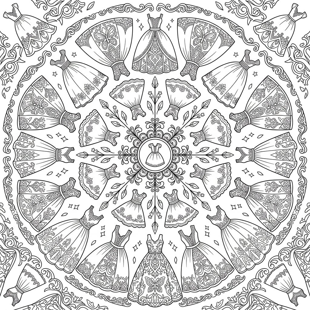 Dive into a world of fashion and tranquility with this exquisite adult coloring page. This intricate mandala design is artfully crafted from a collection of elegant dresses, offering hours of mindful creativity.