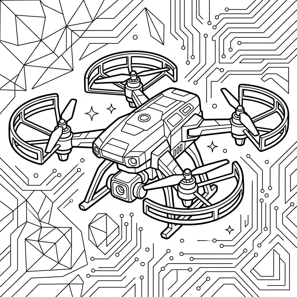 Beyond the central drone, the background pulsates with a dynamic fusion of abstract geometric shapes and classic circuit board patterns. These elements create an immersive, futuristic atmosphere, suggesting connectivity and advanced engineering. Coloring this page offers a unique opportunity to blend the mechanical with the artistic, allowing you to envision vibrant energy flows through the circuits or give the geometric forms a three-dimensional pop with your chosen palette.