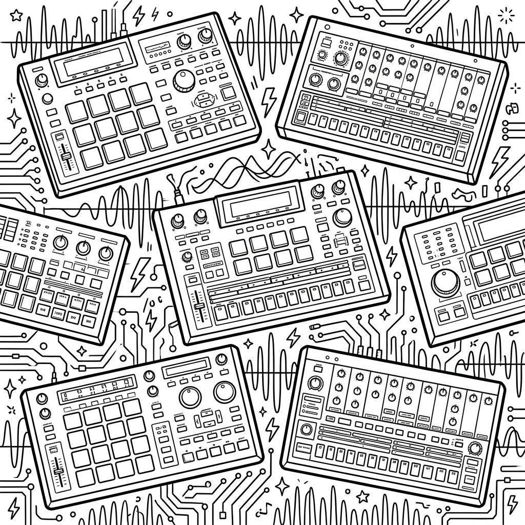 This dynamic illustration captures the energetic essence of electronic music creation, transforming the complex interfaces of these beat-making instruments into a canvas for your imagination. The background pulses with abstract sound waves and geometric circuit-like patterns, interspersed with playful lightning bolts and tiny stars, evoking the electrifying atmosphere of a studio session or a live performance. It's an invitation to visualize the sounds and rhythms these machines produce, bringing them to life with your chosen palette.