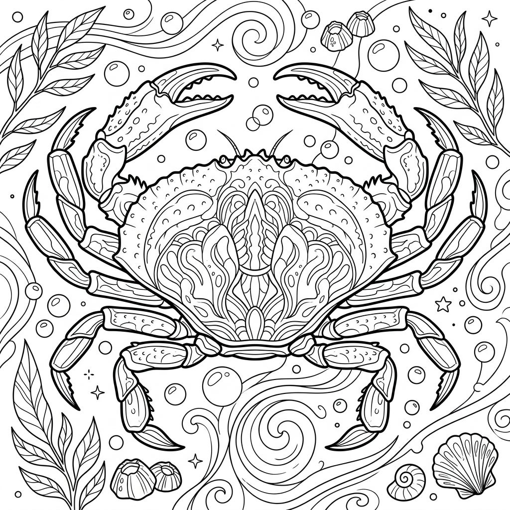 Unleash your creativity with this stunning Dungeness Crab coloring page designed for adults. Its intricate details and ocean-themed background offer a captivating challenge and a soothing escape.