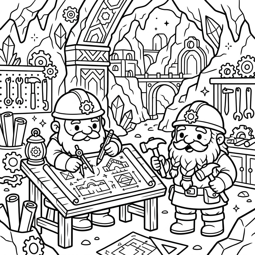 Embark on an enchanting coloring adventure with our Kawaii Dwarf Architects template! This delightful scene depicts two cheerful dwarven builders, complete with cute hard hats and bushy beards, diligently working on their grand architectural plans. One dwarf is engrossed in drawing intricate blueprints at a drafting table, while his companion proudly displays his trusty hammers, ready for construction. The entire image captures the bustling energy of an underground workshop, filled with charming details like pegboards laden with tools, glowing crystals, and ornate gears.