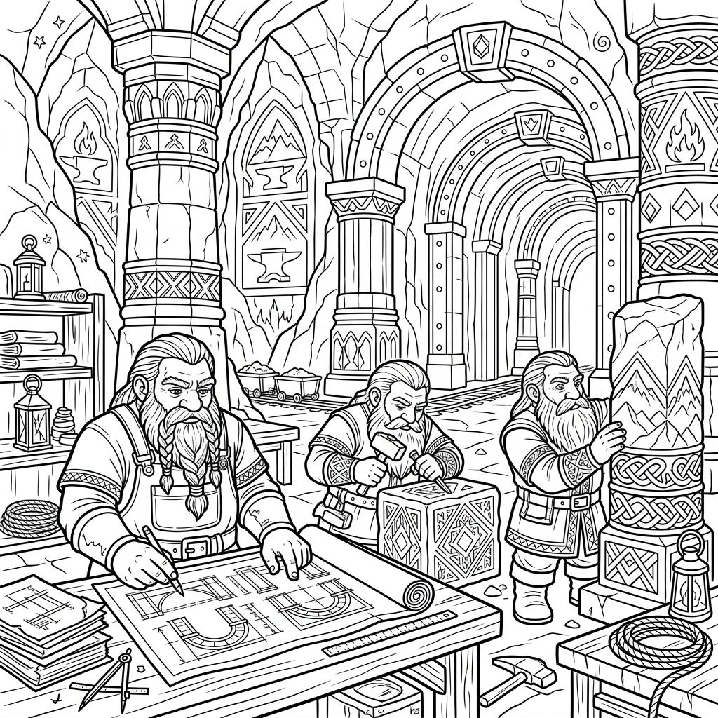 Journey into the heart of the mountains with our Dwarf Architects coloring page, showcasing master builders crafting their magnificent underground realm. Discover intricate details and bring this epic scene to life with your favorite colors.