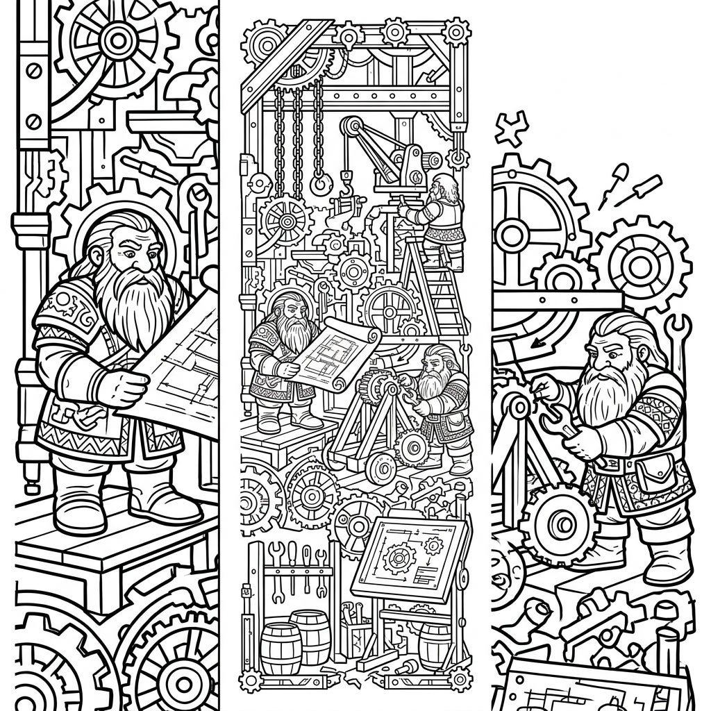 Step into a meticulously crafted world of dwarven ingenuity with these three detailed bookmark coloring pages. Each vertical panel showcases a different scene of industrious dwarf engineers hard at work: one poring over intricate blueprints, another group collaborating amidst a bustling workshop of gears and levers, and a third expertly fine-tuning a complex mechanism with a wrench. The backgrounds are a mesmerizing labyrinth of cogs, pipes, and mechanical components, promising an immersive coloring adventure.