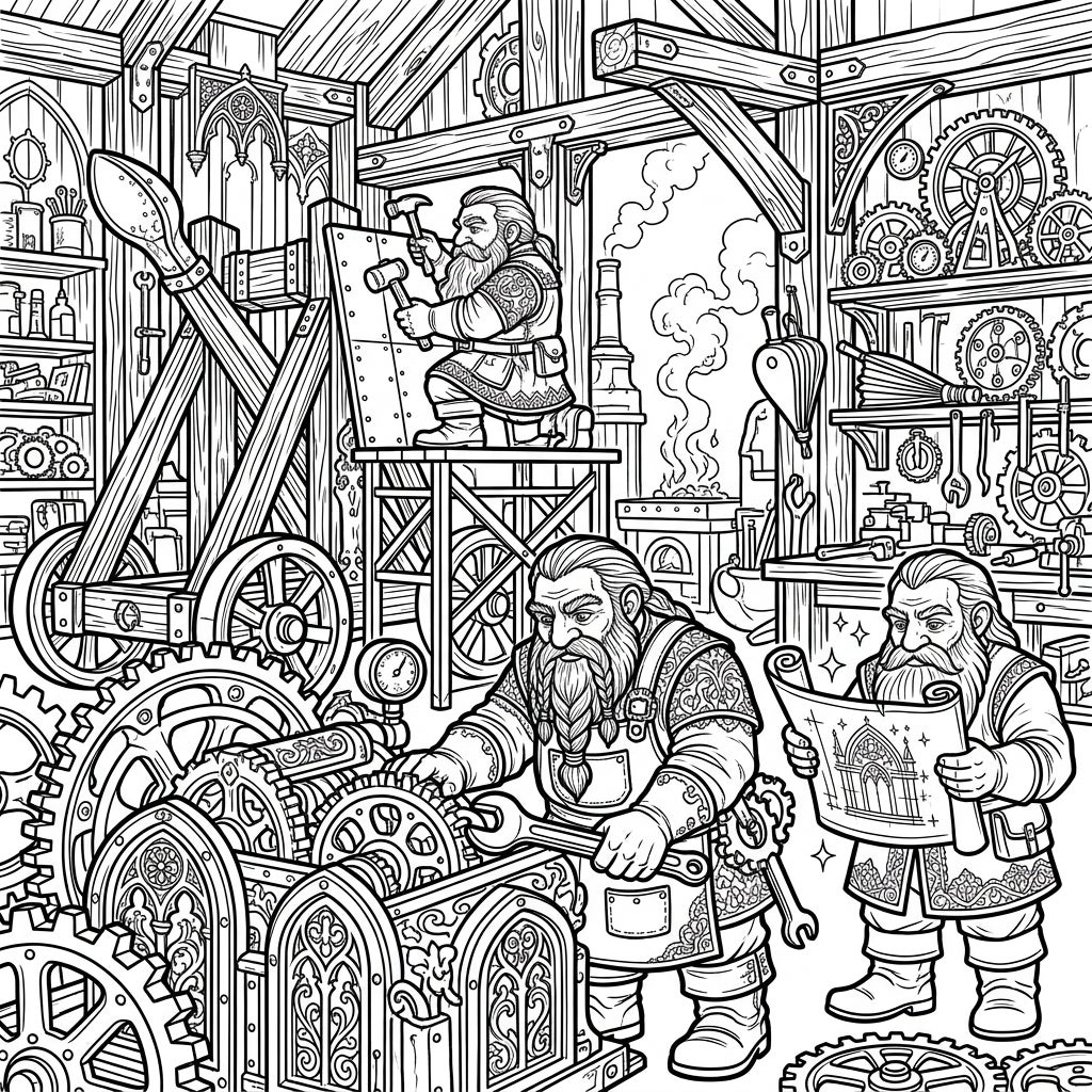 Bring this intricate scene to life with your favorite colors! Consider using metallic shades for the gears and tools, earthy tones for the wooden structures, and deep, rich colors for the dwarves' clothing to enhance the gothic atmosphere. Don't shy away from adding subtle highlights and shadows to emphasize the three-dimensional aspects of the machinery. Whether you prefer vibrant hues or a more subdued palette, this Dwarf Engineers and Gothic workshop provides an endlessly engaging canvas for your artistic expression. Grab your pencils and embark on an epic coloring journey!