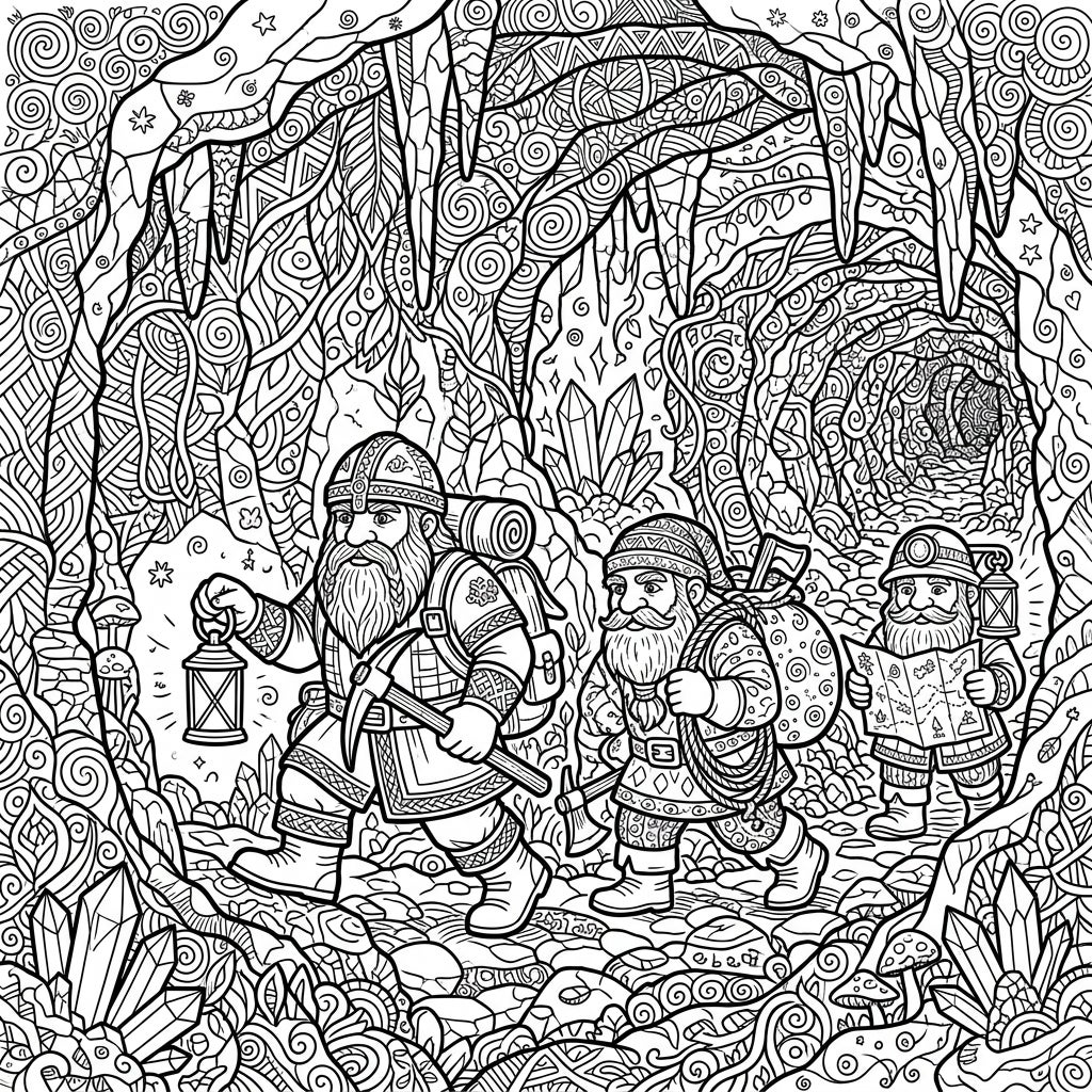 Dive into a subterranean world with these intrepid dwarf explorers, depicted in a mesmerizing Zentangle style. This intricate coloring page offers a unique blend of adventure and mindful creativity for enthusiasts of all ages.