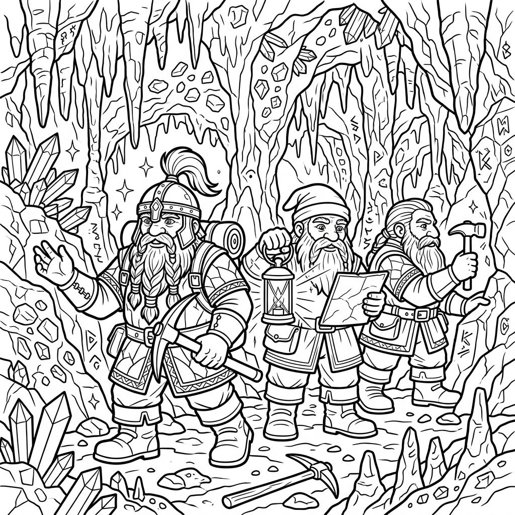 Join a team of brave Dwarf Explorers as they navigate a mysterious underground cavern filled with sparkling crystals and ancient secrets. This intricate coloring page invites you to bring their thrilling search for treasure and knowledge to life.