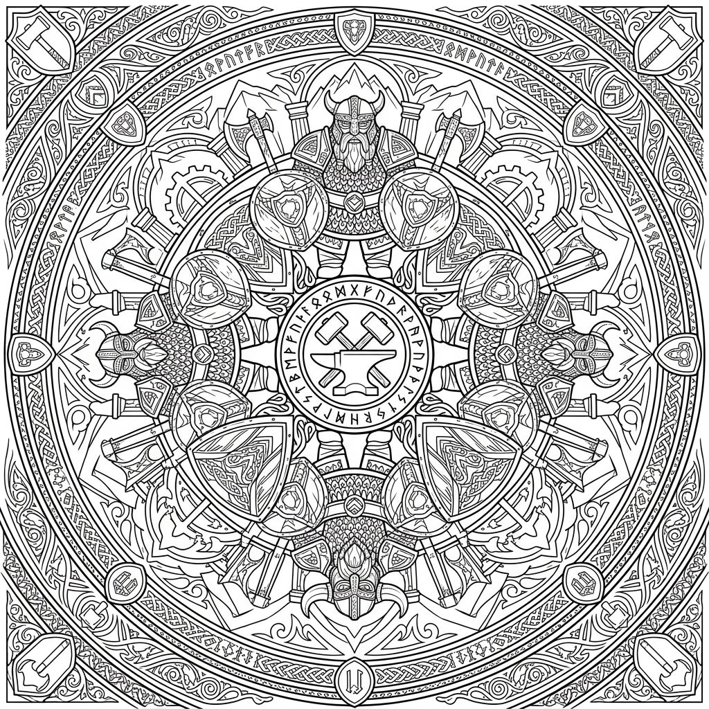 Step into a realm of ancient craftsmanship and steadfast loyalty with our Dwarf Guardian Mandala coloring page. This extraordinary design presents a perfectly symmetrical radial pattern, where stoic dwarven guardians stand sentinel. Each dwarf is adorned with finely detailed armor, horned helmets, and formidable axes, clutching ornate shields that form part of the circular rhythm. At the heart of this intricate composition lies a central anvil, flanked by hammers and encircled by mystical runes, symbolizing the dwarves' legendary forging skills.