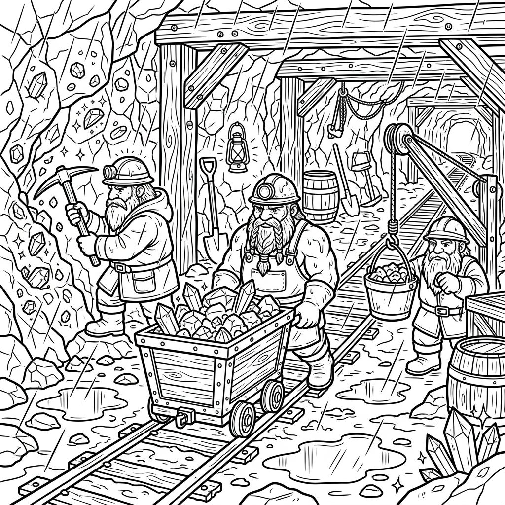 Delve into a subterranean world with this dynamic coloring page featuring sturdy dwarf miners hard at work. Experience the atmospheric beauty of a rainy day deep within the gem-filled caverns.