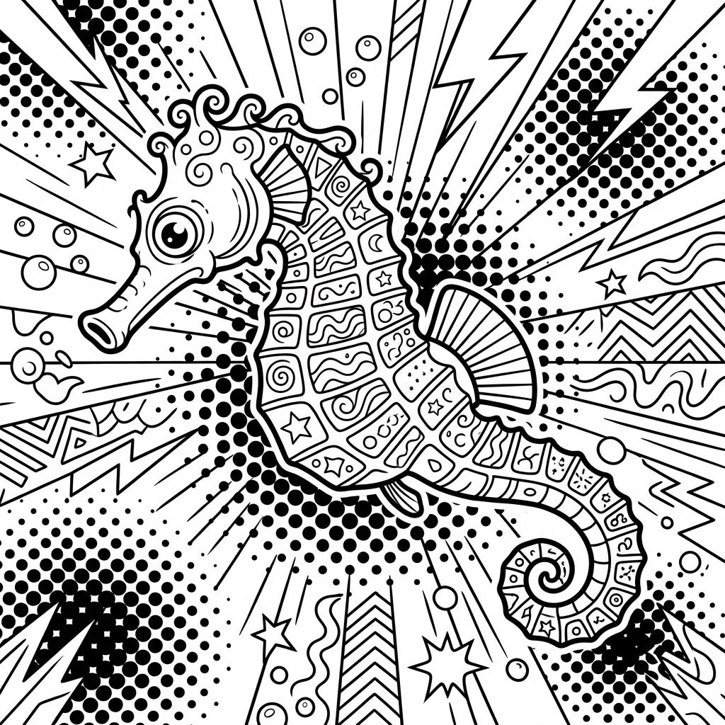Unleash your inner artist with this vibrant Pop Art coloring page featuring a charming dwarf seahorse. Its bold outlines and energetic background offer a uniquely fun and engaging coloring experience for all ages.