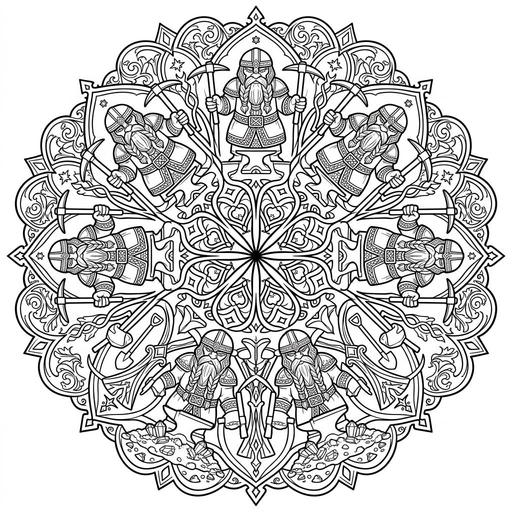 Preparing to color this intricate piece? Consider using metallic shades for the tools and ore to make them gleam against deeper, rich tones for the dwarves' attire and beards. Experiment with a limited palette of dark jewel tones, greys, and silvers to enhance the Gothic mood, perhaps adding subtle highlights to bring out the ornate details. Take your time, letting the symmetrical patterns guide your hand, and enjoy the meditative process of bringing this epic dwarf mandala to vibrant life.