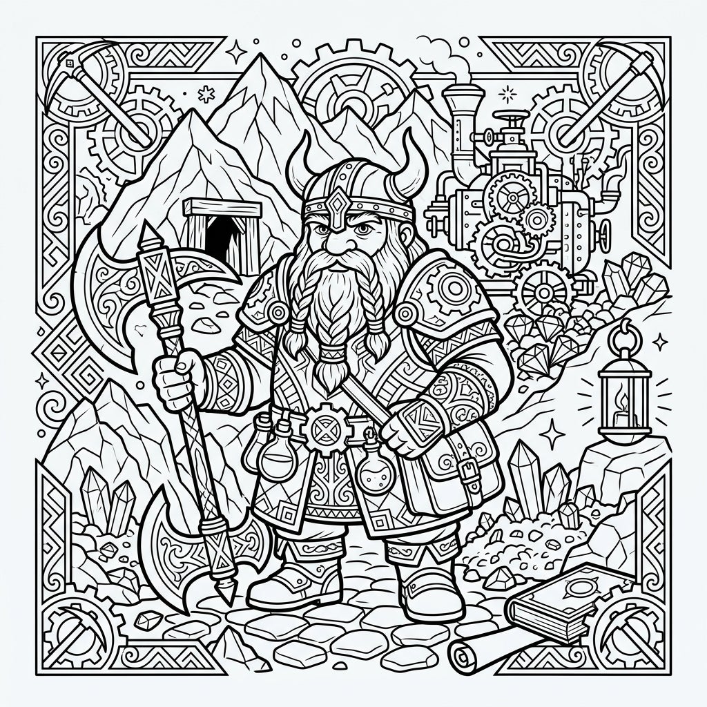 Embark on a grand artistic journey with this detailed coloring page featuring a mighty dwarf warrior. Perfect for teens, this intricate design combines fantasy lore with exciting mining elements for hours of creative fun.