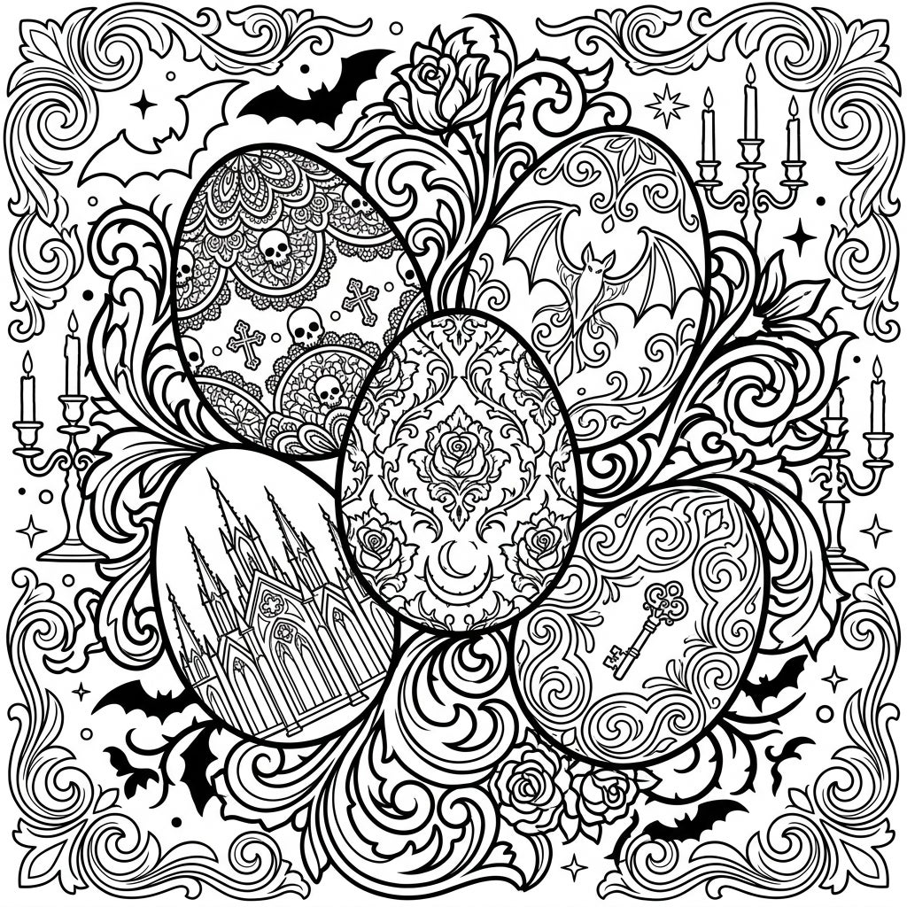 Step into a world where holiday tradition meets dark enchantment with this 'Dyed Easter Eggs x Gothic' coloring template. This stunning page presents five intricately patterned Easter eggs, each a miniature canvas for gothic artistry, nestled amidst a lavish frame of swirling vines, thorned roses, and elegant candelabras. Discover unique designs on every egg, from macabre skulls and crosses to soaring bats, a majestic gothic cathedral, lush damask patterns with a crescent moon, and a mysterious skeleton key, all waiting for your creative touch.