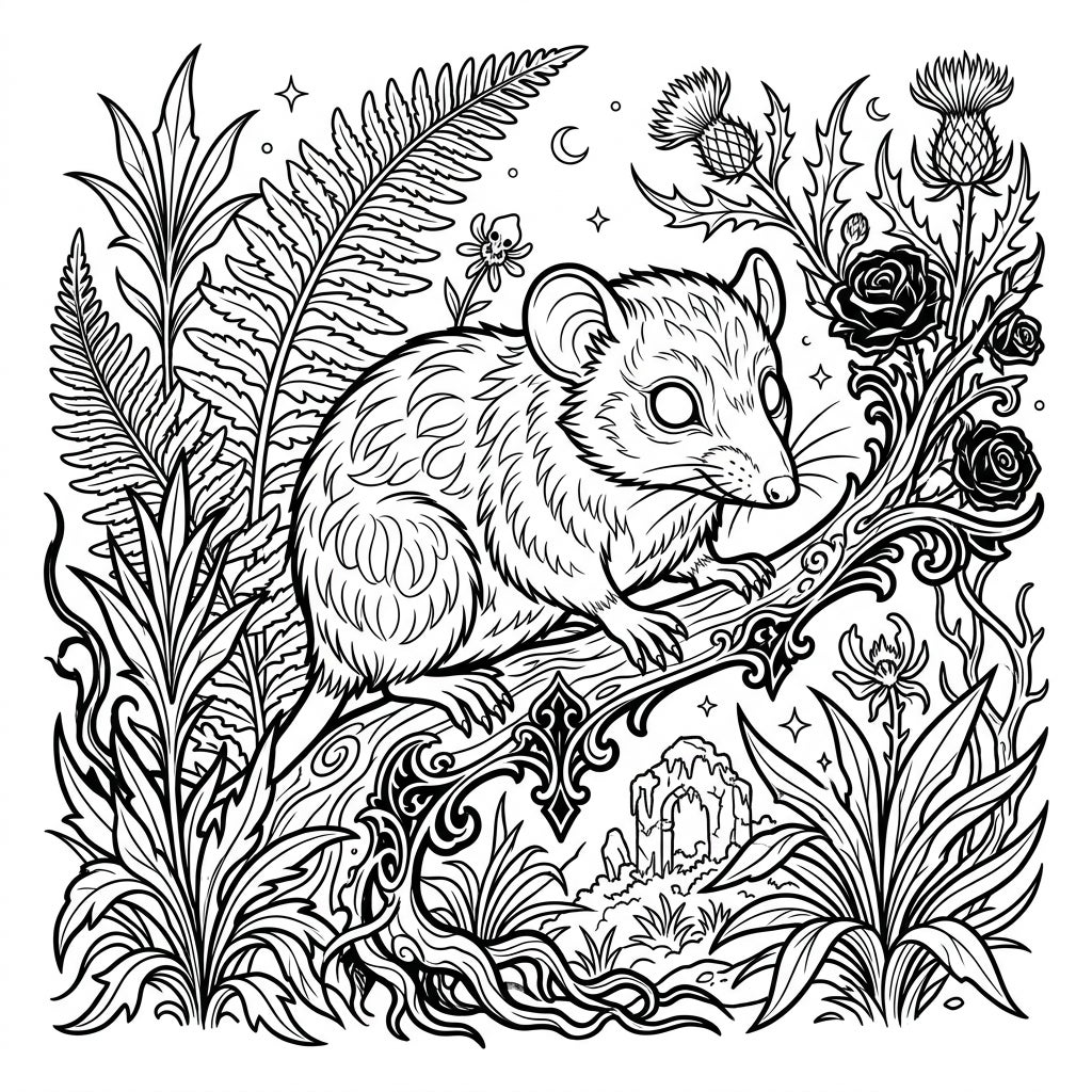 Step into a captivating scene where history and fantasy intertwine, featuring a charming early mammal. This intricate coloring template showcases a small, furry creature, reminiscent of a shrew or mouse, perched on a beautifully gnarled branch adorned with ornate, swirling patterns typical of Gothic design. Surrounding this secretive animal is a rich tapestry of flora: delicate ferns unfurl their fronds, thorny thistles stand tall, and dark, romantic roses bloom amidst lush, stylized foliage, creating a dense and visually engaging environment.