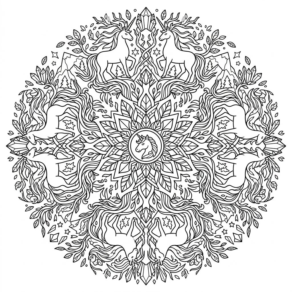 Immerse yourself in the breathtaking detail of this Earth Unicorn Mandala, a masterpiece of natural symmetry and mystical artistry. The circular design unfurls from a central medallion, featuring the regal head of a unicorn, surrounded by an abundance of flowing leaves and elegant floral patterns. Eight majestic Earth Unicorns, their manes and tails transforming into vibrant foliage, are gracefully positioned around the mandala, interspersed with sparkling crystals, rugged mountain peaks, and delicate stars, inviting a truly immersive coloring experience.