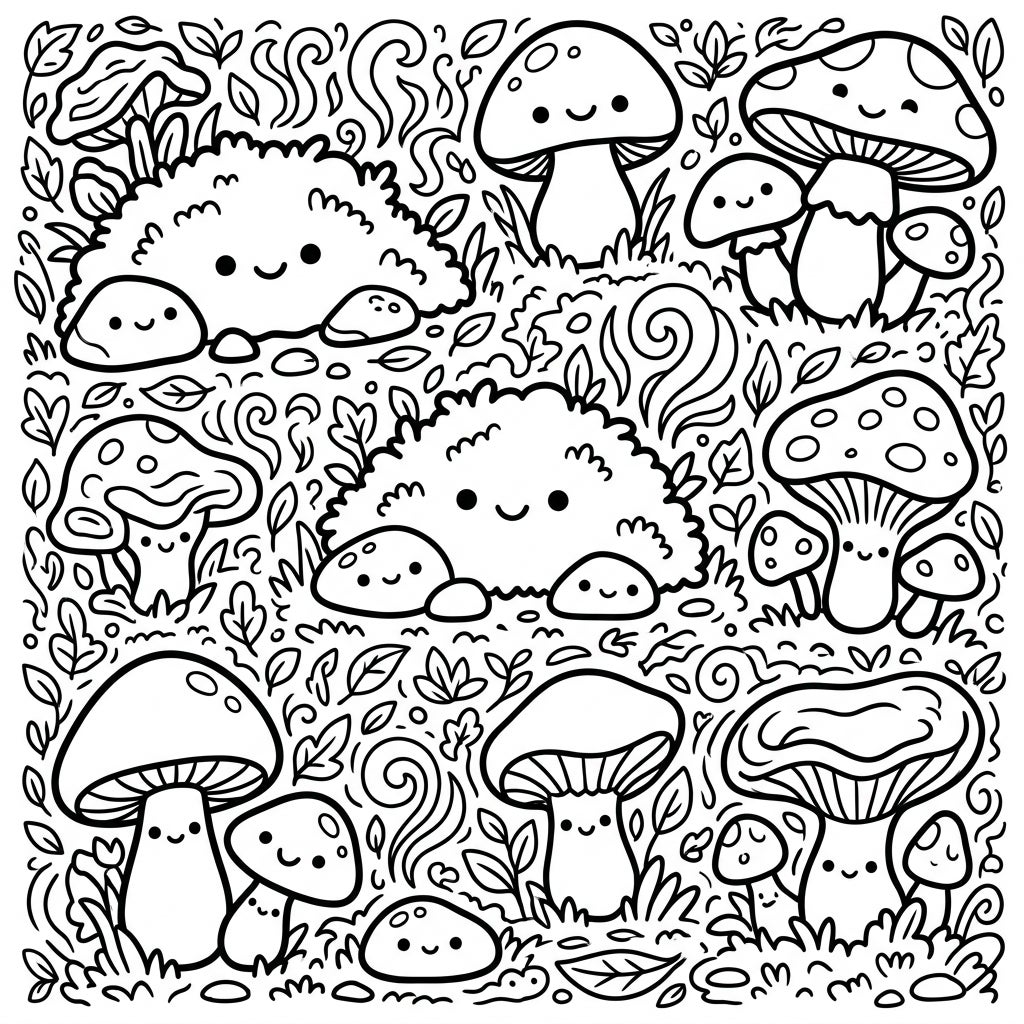 Step into a whimsical world where adorable Kawaii mushrooms and cheerful moss clumps invite you to explore nature's gentle beauty. This intricate coloring page promises a delightful and relaxing artistic adventure for all ages.