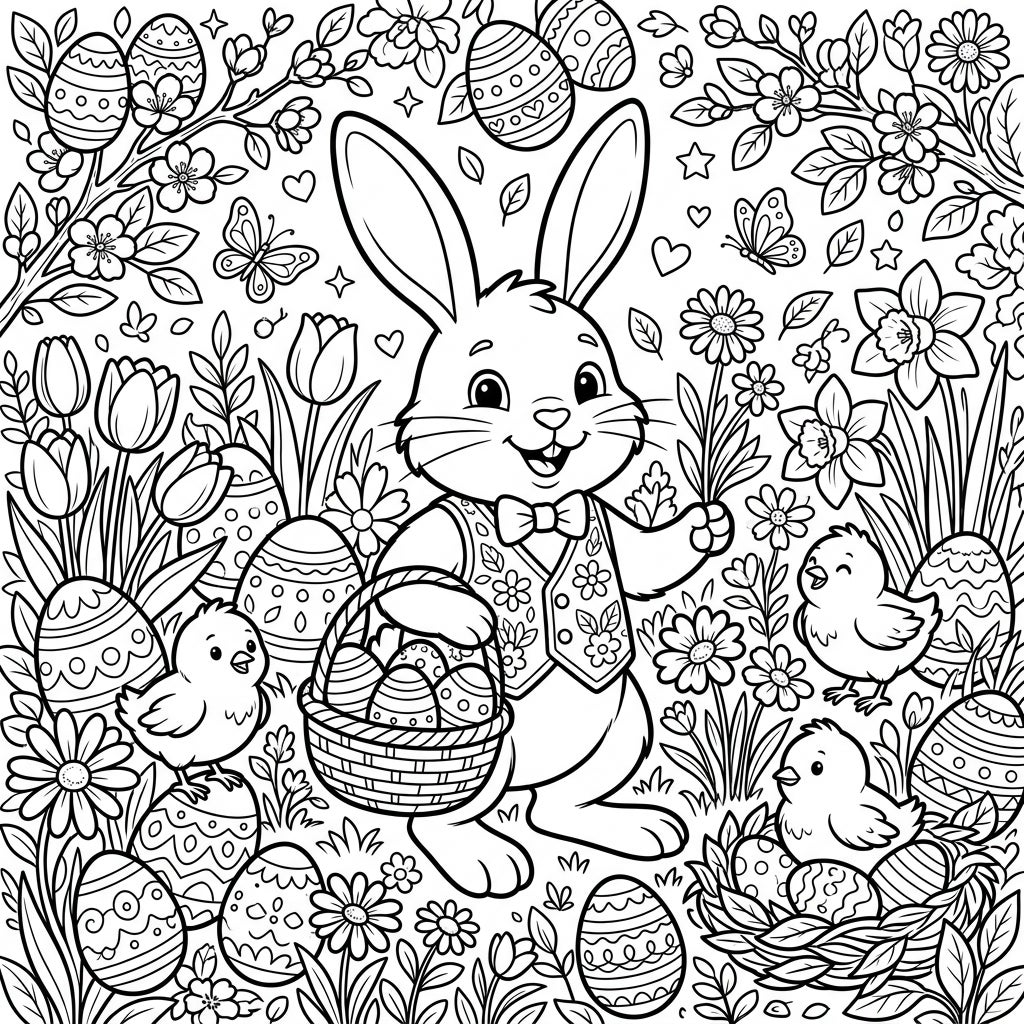 This intricately designed coloring page brings a lively Easter celebration to life, centered around a charming Easter Bunny dressed in a detailed vest and bow tie. With a joyful smile, the bunny holds a woven basket overflowing with beautifully patterned Easter eggs, while clutching a fresh sprig of leaves. The scene is further animated by two adorable baby chicks; one stands proudly on a decorated egg, and another nestles comfortably in a cozy leaf-filled nest among more scattered eggs. Surrounding them is a lush spring landscape, bursting with a variety of flowers including delicate tulips and cheerful daffodils, intertwined with blossoming branches and playful butterflies, creating a truly immersive coloring experience.
