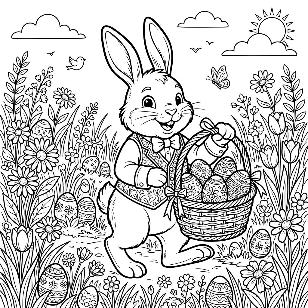 Celebrate the joy of Easter with this delightful coloring page featuring a charming Easter Bunny. He's ready to deliver his basket brimming with beautifully decorated eggs, nestled in a vibrant spring meadow.