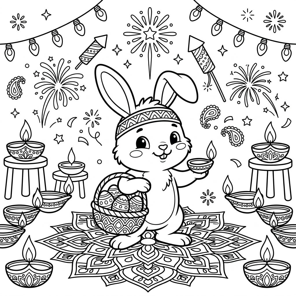 Designed specifically for kids, this page offers clear, balanced lines and moderate detail, making it perfect for little hands to explore their creativity. Encourage children to use bright, bold colors for the diyas and fireworks, and perhaps soft pastels for the bunny and eggs. Coloring this engaging scene not only provides hours of artistic fun but also introduces children to diverse cultural celebrations, enhancing their fine motor skills and encouraging imaginative play. Get ready to illuminate this festive fusion with your favorite colors!