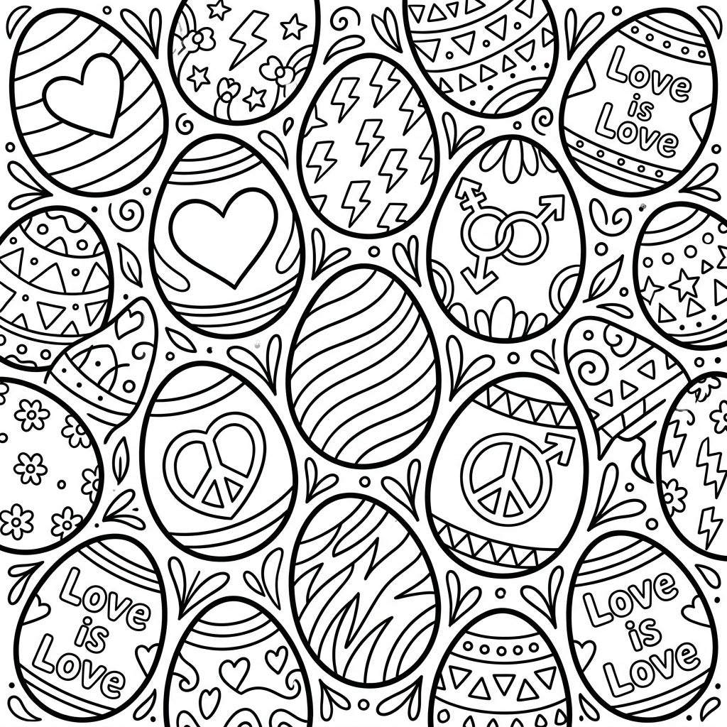 Immerse yourself in a beautifully detailed coloring experience featuring a captivating array of Easter eggs, each a miniature canvas of celebration. This full-page design showcases over a dozen eggs, intricately adorned with a diverse collection of patterns and symbols. Discover hearts, peace signs, interlocking gender symbols, playful lightning bolts, and inspiring 'Love is Love' messages, all nestled amidst swirling accents and geometric motifs. Every inch of this linear art illustration invites your creativity to bring it to life.