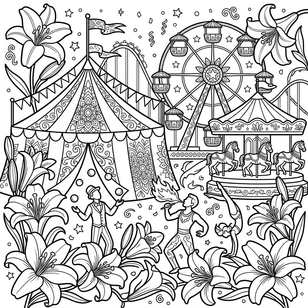 Step right up to a whimsical blend of spring beauty and carnival excitement! This enchanting coloring page features elegant Easter lilies intertwined with a lively fairground full of classic attractions and joyful performers.