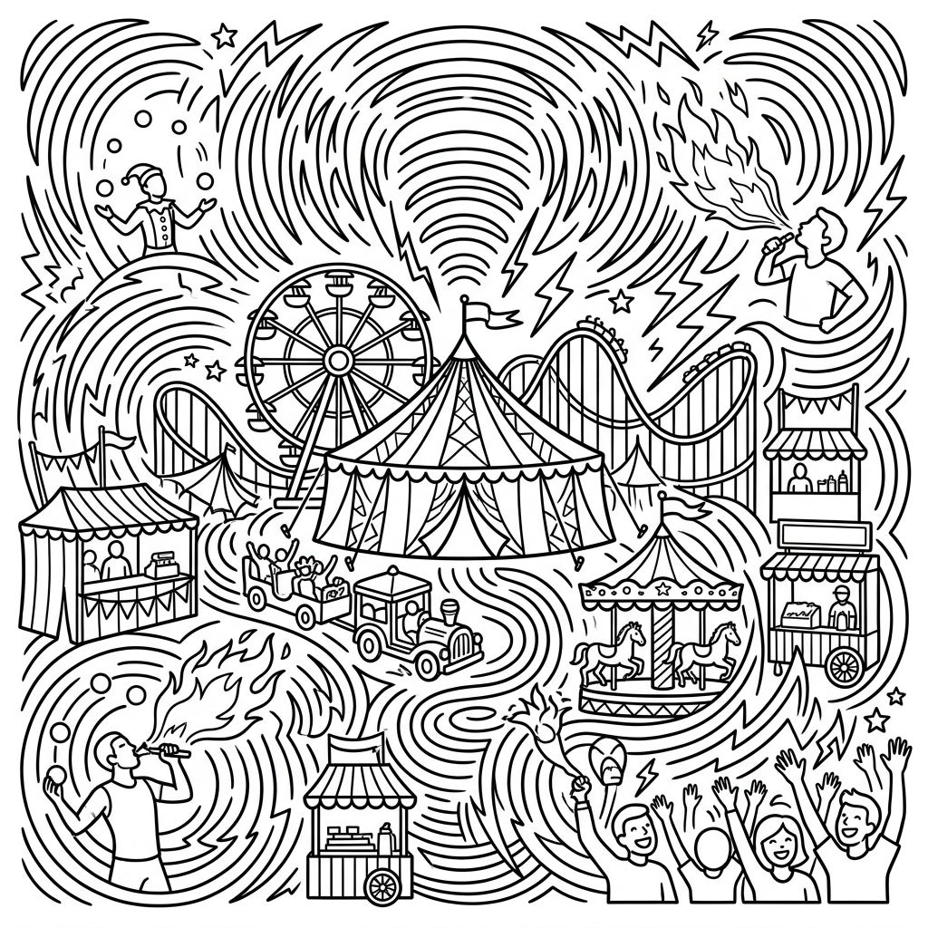 What makes this carnival coloring page truly unique is the dynamic integration of 'echoing thunder' patterns. These swirling, reverberating sound waves and sharp lightning bolts weave through the entire illustration, capturing the electrifying energy and loud, joyous atmosphere of a busy fairground. Imagine the roars of the crowd, the rumbles of the rides, and the booming announcements, all visually represented to inspire a vibrant, action-packed coloring experience.