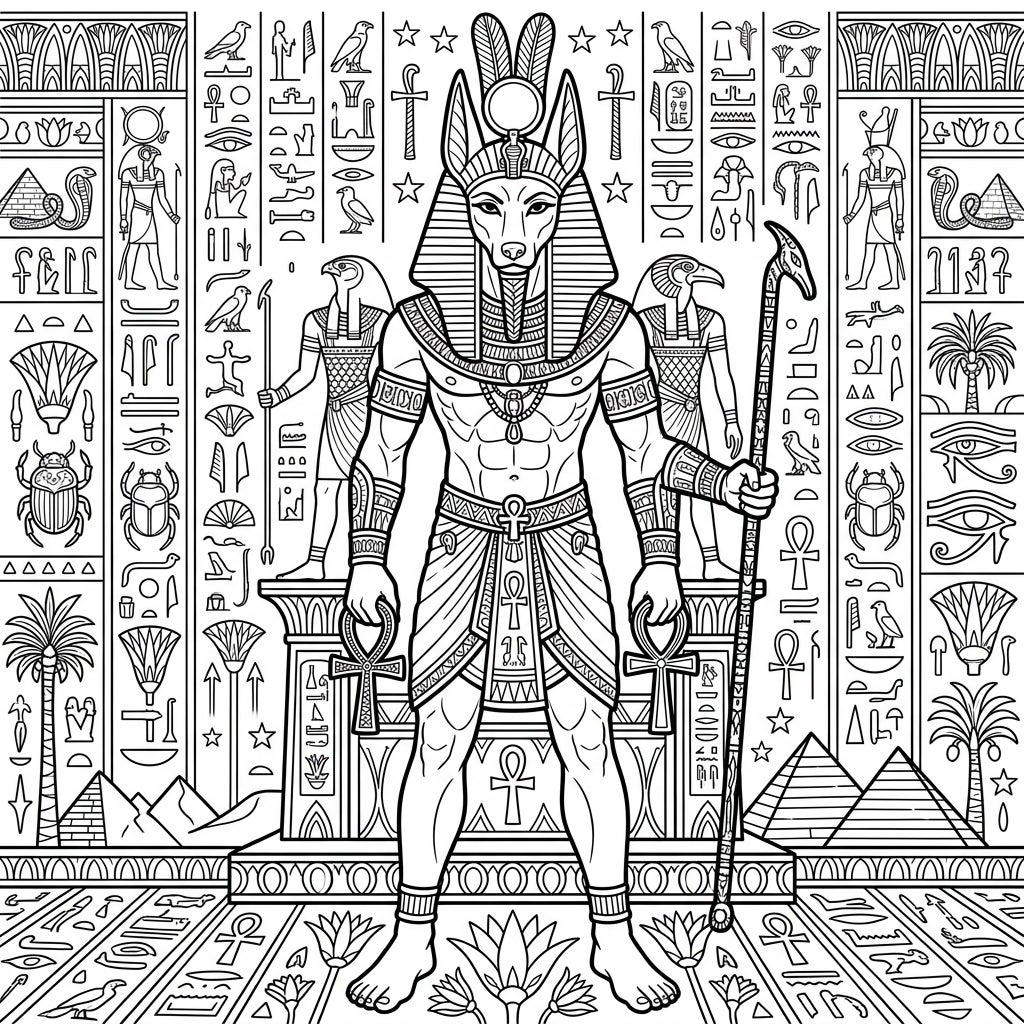Journey back to the time of pharaohs with this captivating coloring template featuring Anubis and other powerful Egyptian deities. Immerse yourself in a world of hieroglyphs and ancient symbols, perfect for a relaxing and educational coloring experience.