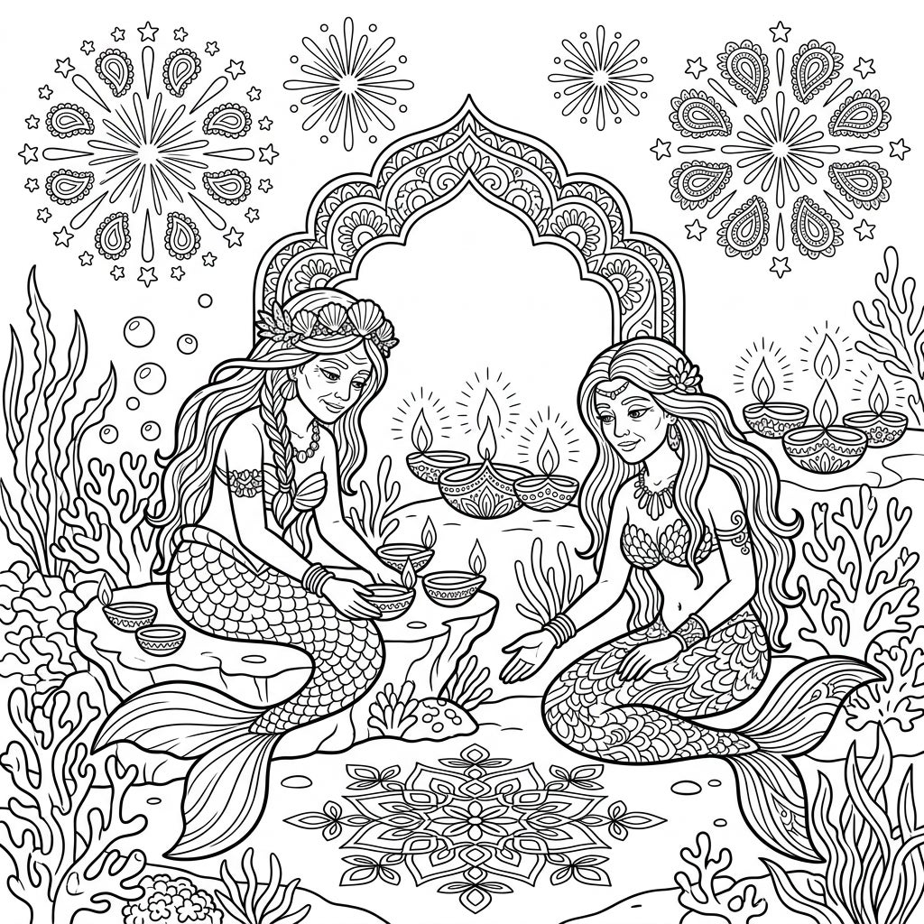 Celebrate Diwali in a magical new way with this unique coloring page featuring wise elder mermaids. Immerse yourself in an underwater festival filled with beautiful diyas and intricate patterns.