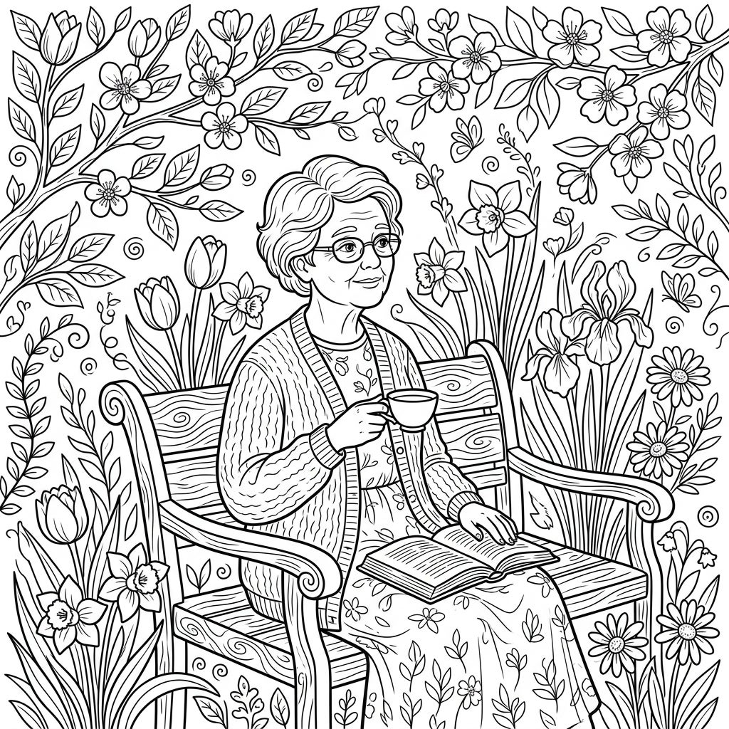 Step into a beautifully detailed spring scene where an elderly woman finds solace amidst nature's awakening. This intricate coloring page features a kind-faced lady with glasses and short, wavy hair, comfortably seated on a rustic wooden bench. An open book rests gently on her lap, and she holds a delicate teacup, perhaps savoring a warm beverage while she reads. Surrounding her is a rich tapestry of blooming spring flora, including elegant tulips, cheerful daffodils, majestic irises, and delicate daisies, all intertwined with leafy branches and tiny, fluttering butterflies.