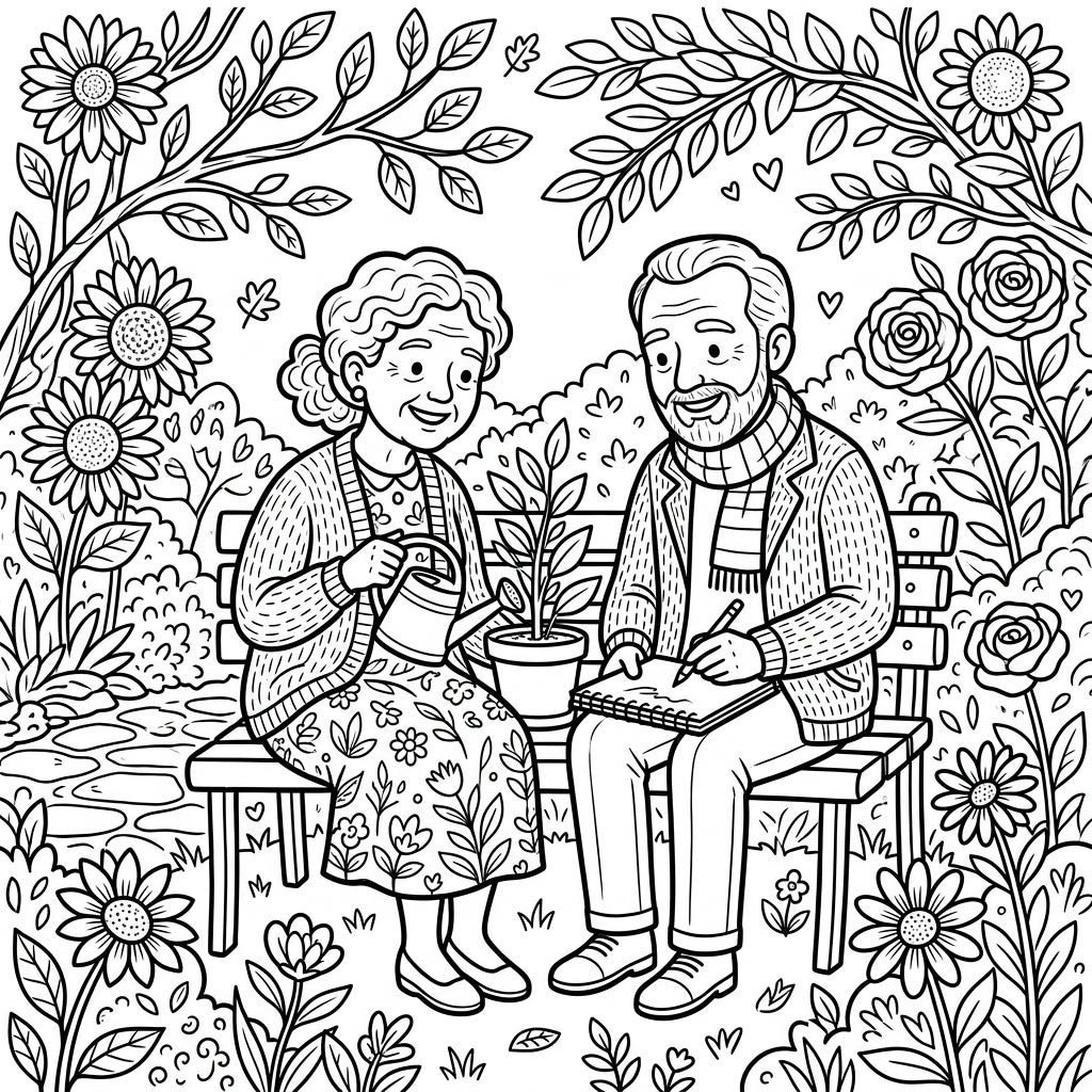 Step into a world of gentle beauty with this intricately designed coloring page, depicting a lovely elderly couple amidst a vibrant garden. The scene centers around an older woman, watering a potted plant with a delicate can, and an older man, diligently sketching in his notebook, both seated comfortably on a rustic park bench. The background and foreground are rich with natural elements, including a variety of blooming flowers like cheerful sunflowers and elegant roses, lush foliage, and winding branches that frame the entire illustration, creating a captivating and detailed landscape.