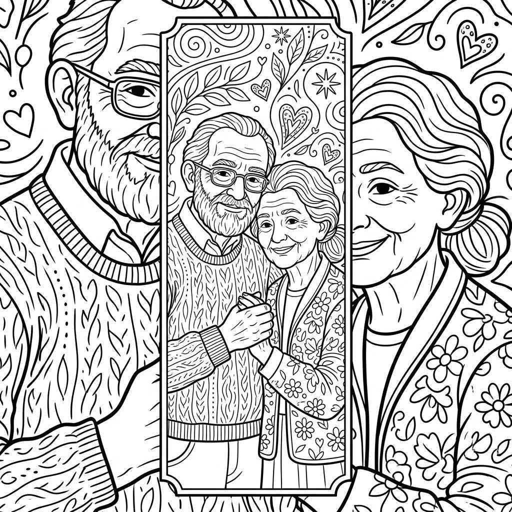 Immerse yourself in the heartwarming scene of an elderly couple, beautifully rendered in intricate line art, perfect for your next coloring adventure. This unique design features a smiling senior couple, holding hands gently, their faces radiating warmth and wisdom. They are encased within a decorative vertical frame, reminiscent of a cherished photograph or a bespoke bookmark, highlighting their enduring bond against a backdrop of swirling vines, delicate hearts, and starry motifs.