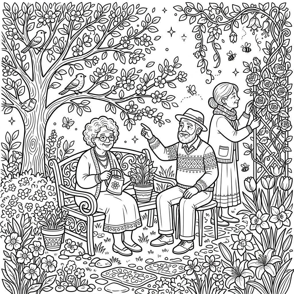 Immerse yourself in the tranquil beauty of a spring garden brought to life by the joyful presence of elderly seniors. This intricate coloring page invites you to celebrate the wisdom of age amidst blooming flowers and cheerful nature.